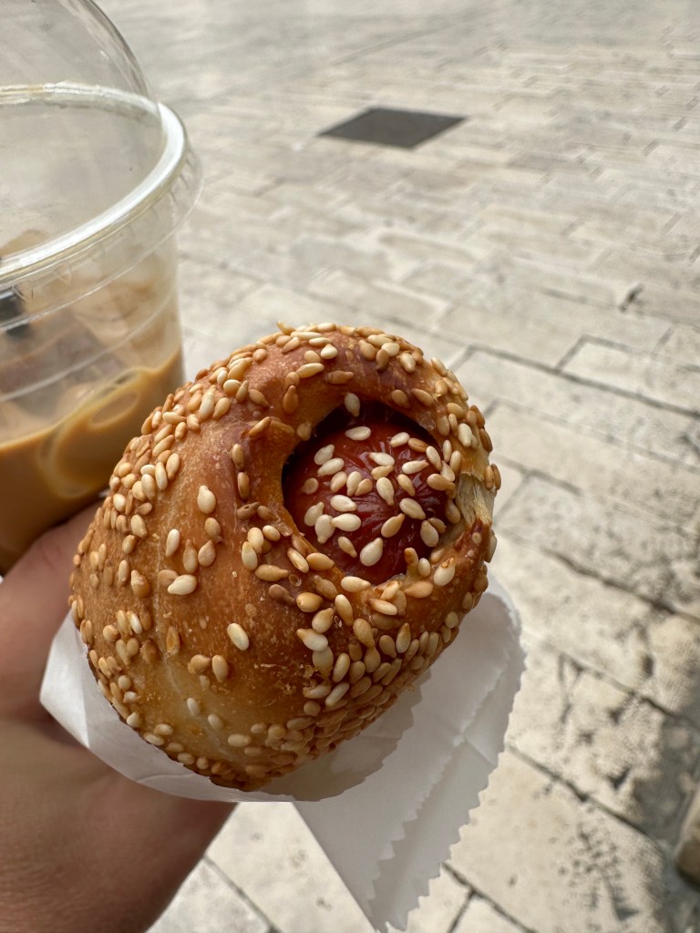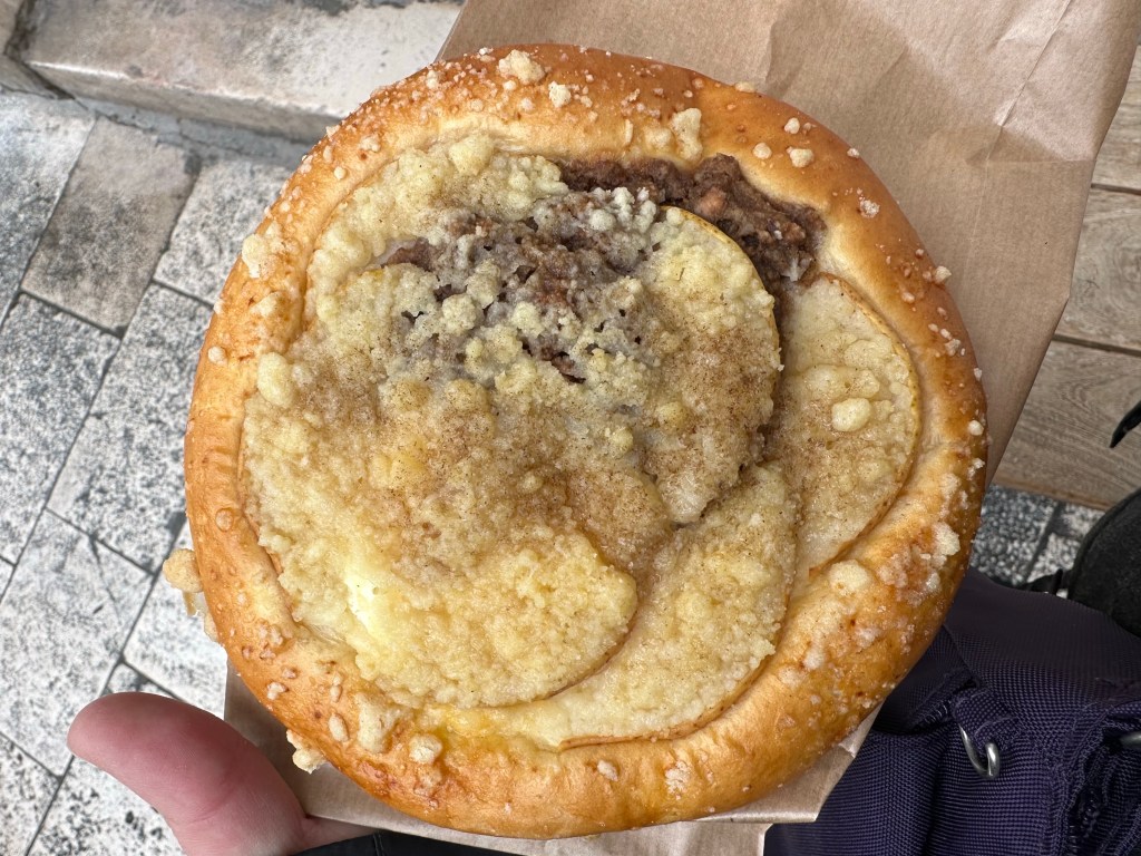 I finally visit the bakery I’ve been wanting to visit Bäckerei Kruscic since it was closed the day before. I had wanted to order something savory but all the labels are in Croatian. Embarrassed to ask what things are I point to one that looks good. It ends up being sweet and somewhat like a Kolach. It has apples and some other things I am not so sure about.