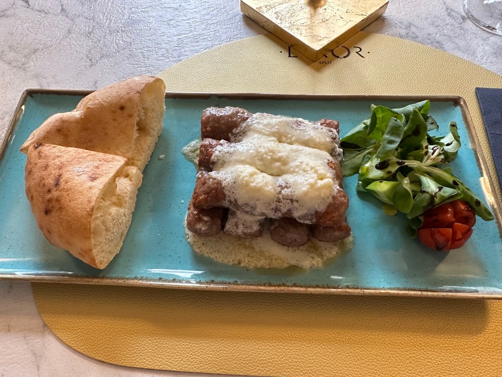 I go to the Luxor restaurant for dinner. I can’t decide what I want so I order the Croatian style cevapi and some seafood arancini balls.