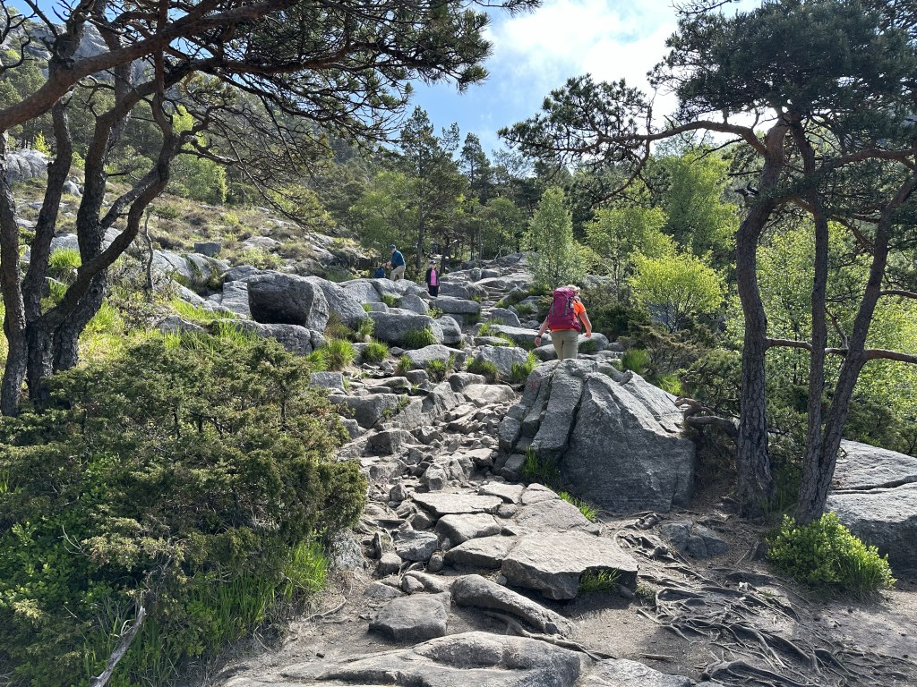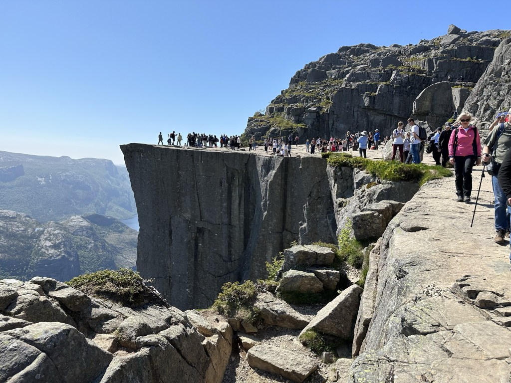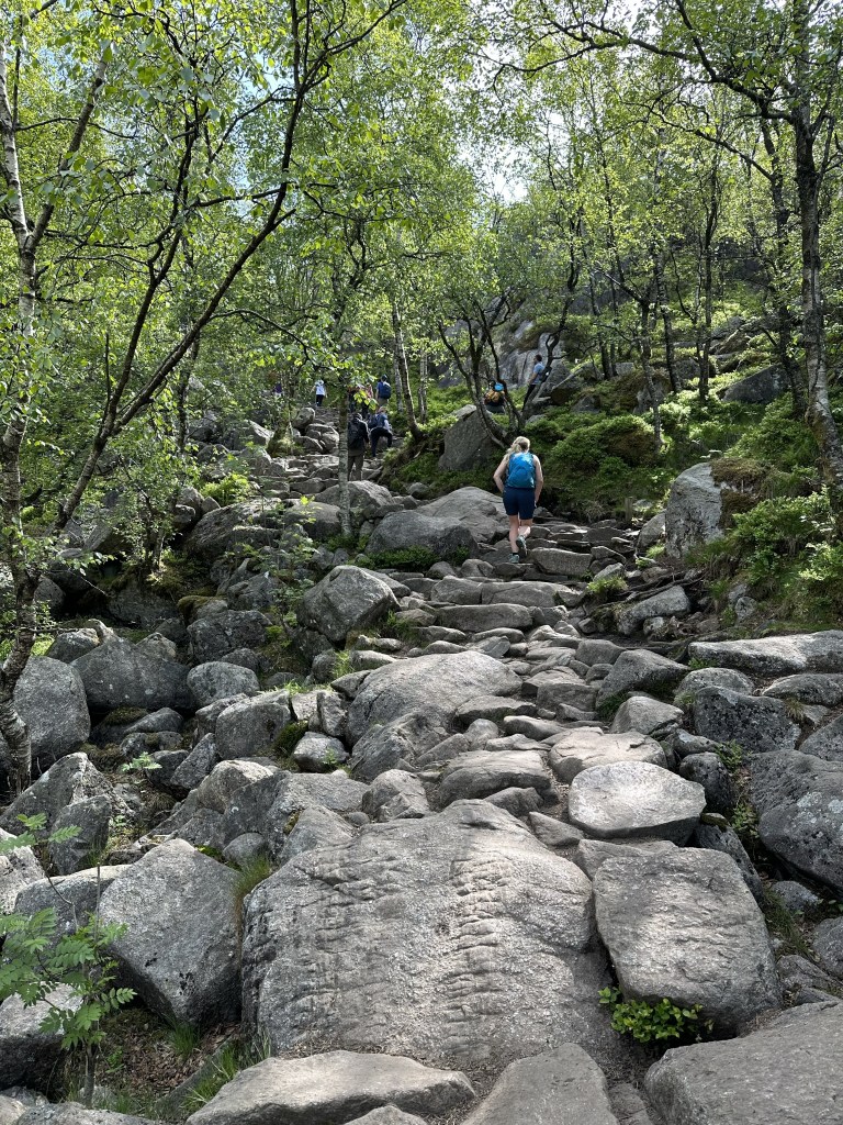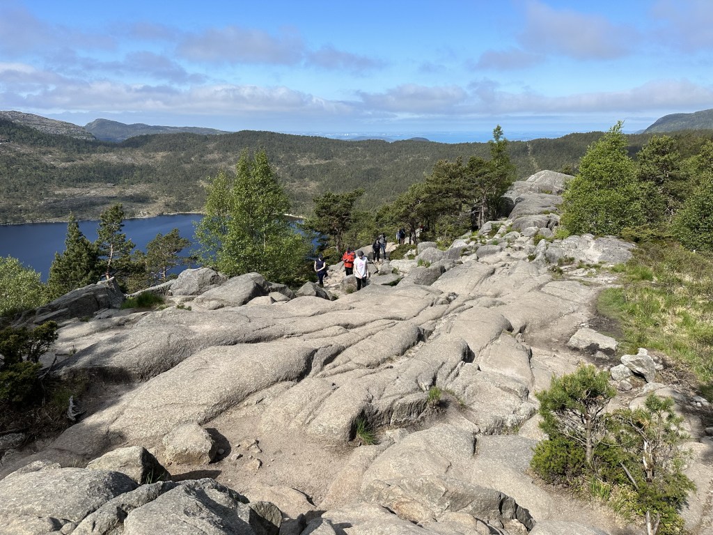 I finally get to Pulpit Rock and it is busy but the crowds don’t seem to annoy me as they normally do. Maybe all the fresh air and exercise has filled my body with extra serotonin. People are picnicking around. I take out the carton of coffee I purchased this morning and enjoy it along with the view. And speaking of the views, they are very nice. It is worth the effort to see the beauty. I take some pictures, relax and then head back. So far the trail as taken the amount of time it was estimated to take (it is estimated 2 hours each way and it took me just slightly over 2 which is notable in itself since I am generally much slower than the estimates say). I want to make sure I have plenty of time to get back to be bus at 4:00 PM since sometimes going down the rocks is much harder than going up – which I can say this is the case today. I feel the pressure on my joints, my knees and lower back. I will be hurting later. Many have walking sticks and while I usually have them when I travel for hiking trips in the USA, I never take them on international adventures. A guy on the trail tells me I should have rented some at the trailhead ….. I had no idea I could do that.