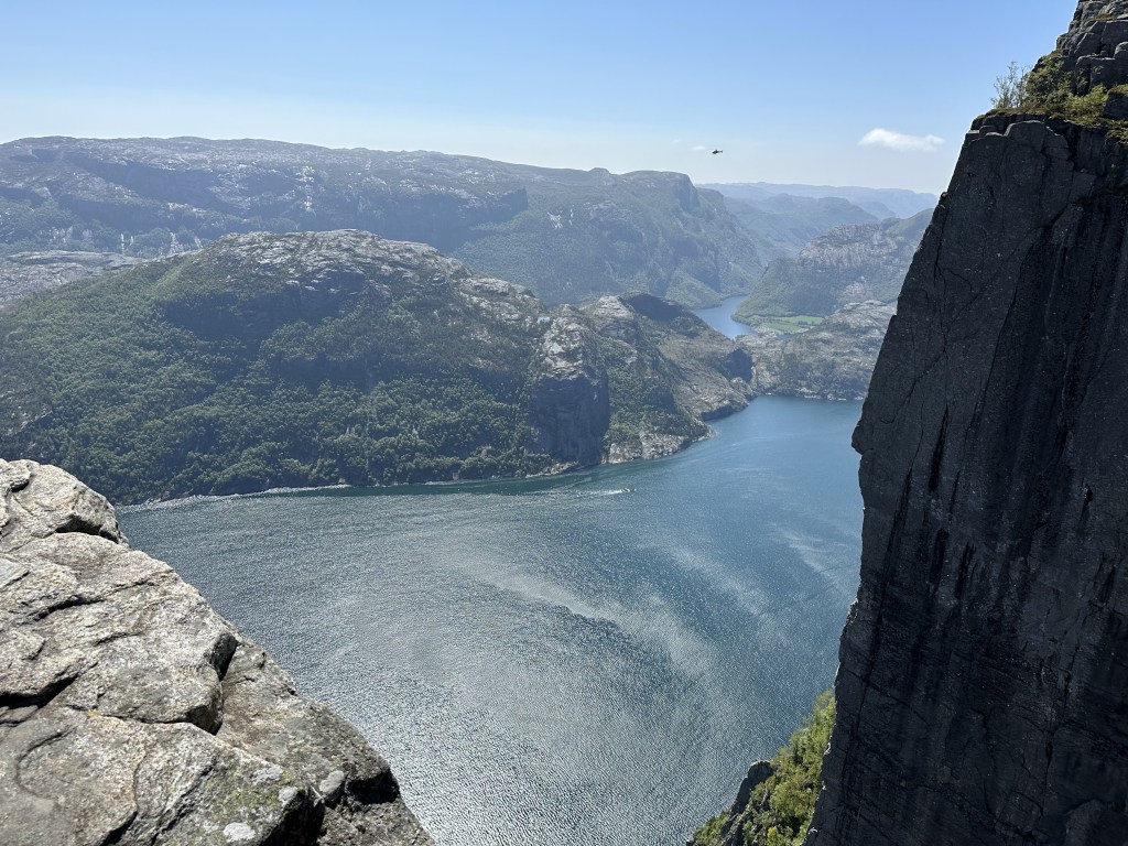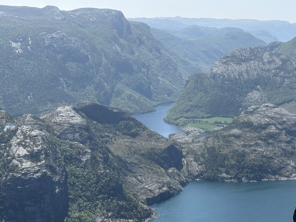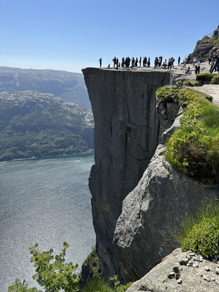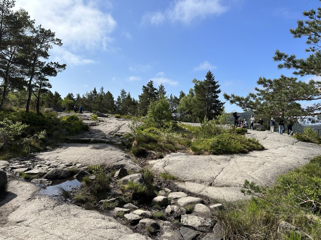 I finally get to Pulpit Rock and it is busy but the crowds don’t seem to annoy me as they normally do. Maybe all the fresh air and exercise has filled my body with extra serotonin. People are picnicking around. I take out the carton of coffee I purchased this morning and enjoy it along with the view. And speaking of the views, they are very nice. It is worth the effort to see the beauty. I take some pictures, relax and then head back. So far the trail as taken the amount of time it was estimated to take (it is estimated 2 hours each way and it took me just slightly over 2 which is notable in itself since I am generally much slower than the estimates say). I want to make sure I have plenty of time to get back to be bus at 4:00 PM since sometimes going down the rocks is much harder than going up – which I can say this is the case today. I feel the pressure on my joints, my knees and lower back. I will be hurting later. Many have walking sticks and while I usually have them when I travel for hiking trips in the USA, I never take them on international adventures. A guy on the trail tells me I should have rented some at the trailhead ….. I had no idea I could do that.