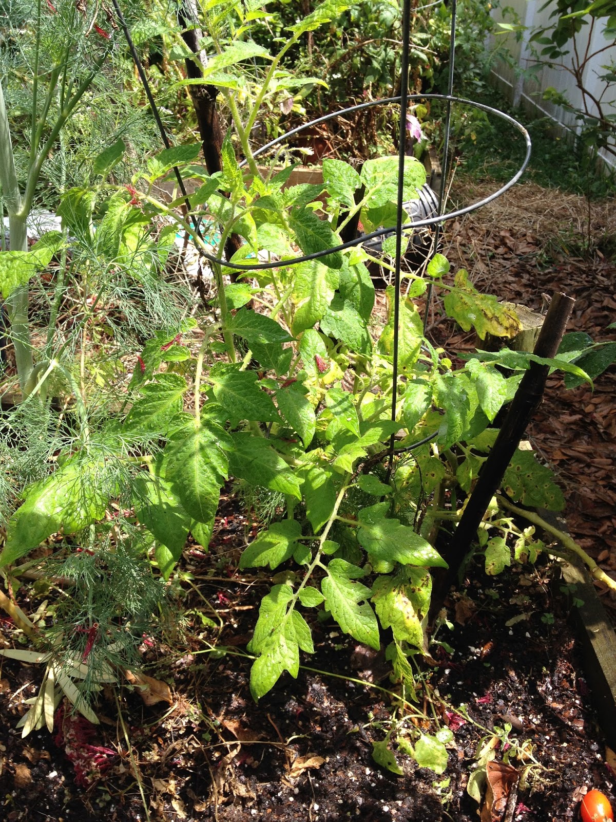 Tomato plant leftover from the winter/spring tomatoes. I never have luck with summer tomatoes but why not try again. It is too healthy to pull out.