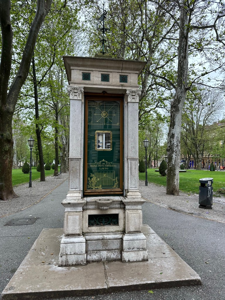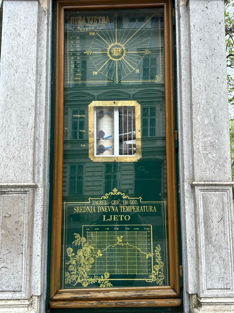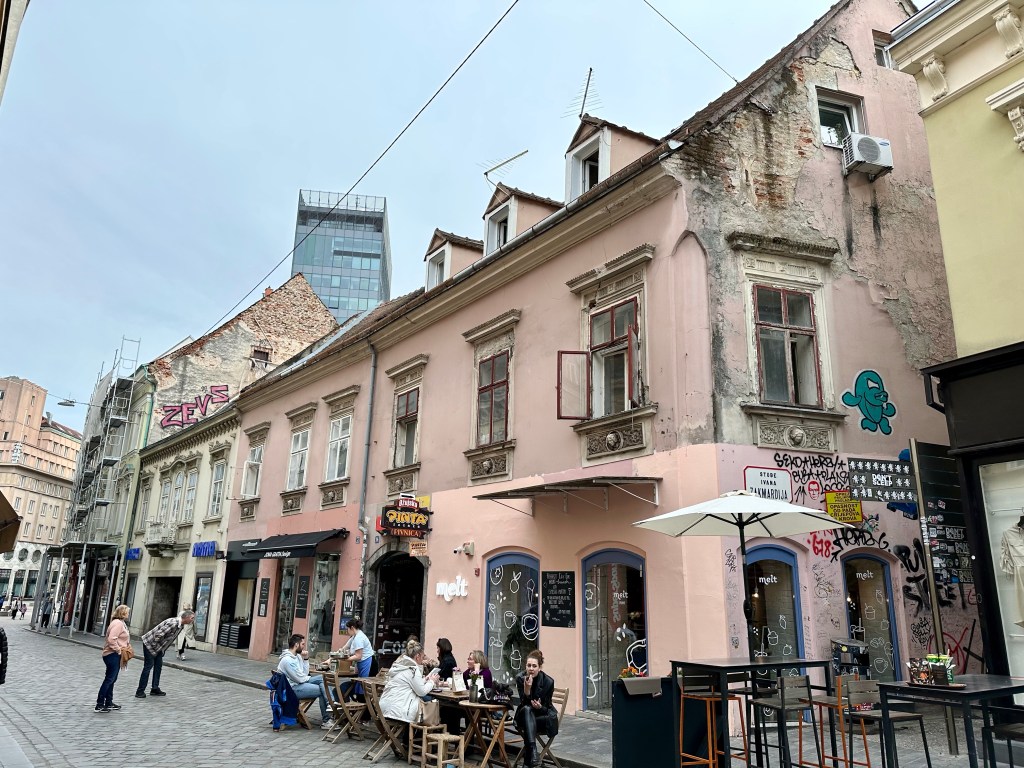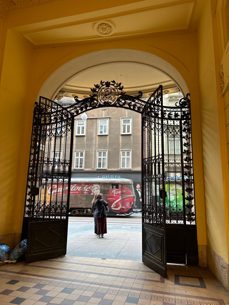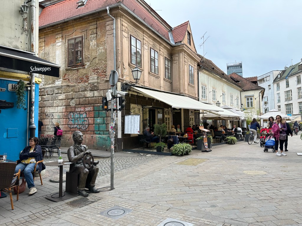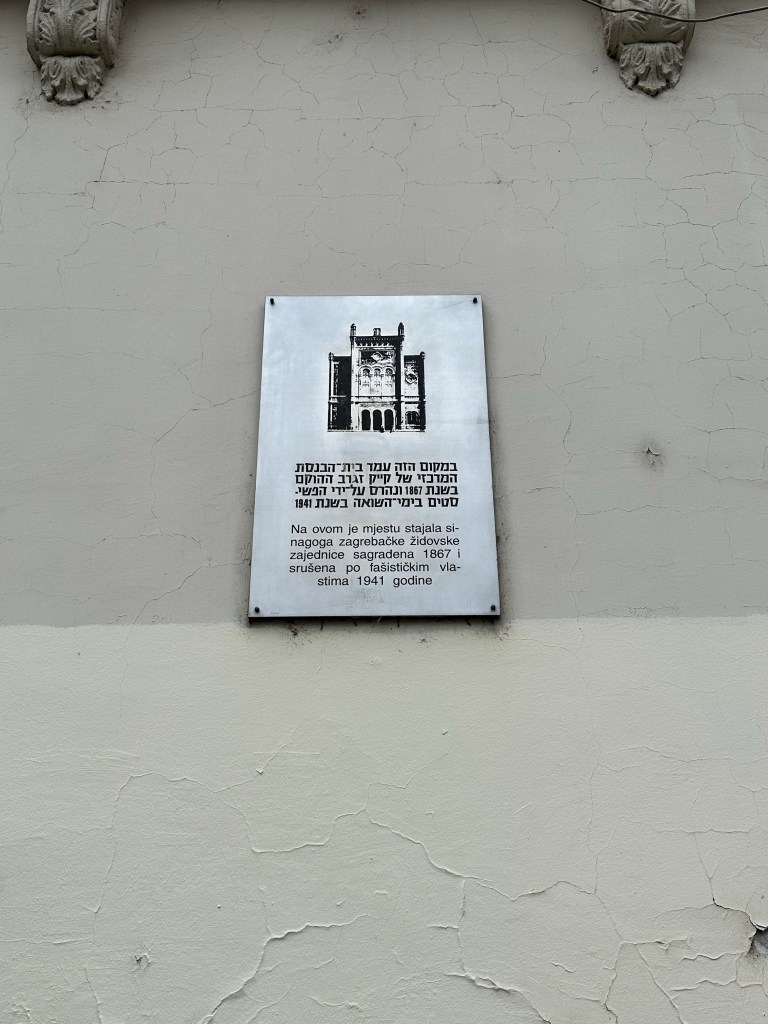 We are told about the performance artist Tomislav Gotovac and the filming of “Zagreb I love you” (I later see this in Graz, Austria in a museum). There is a sidewalk plaque with a footprint noting this moment but I forgot to take a picture.