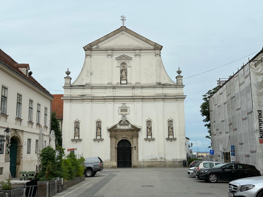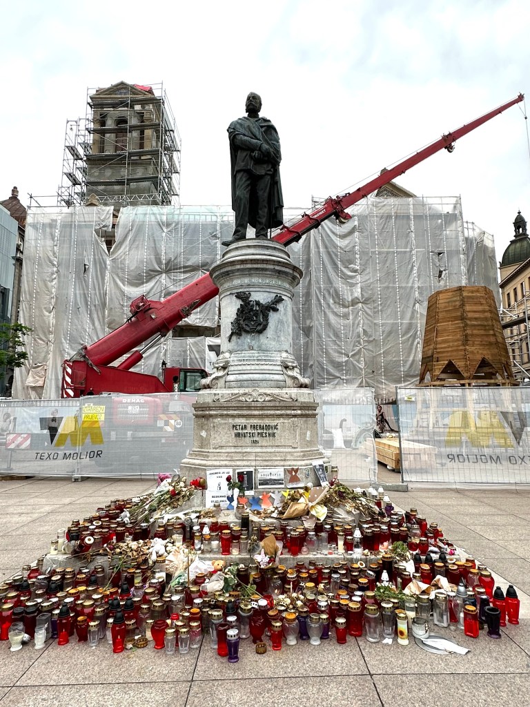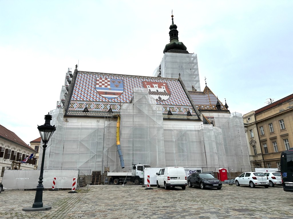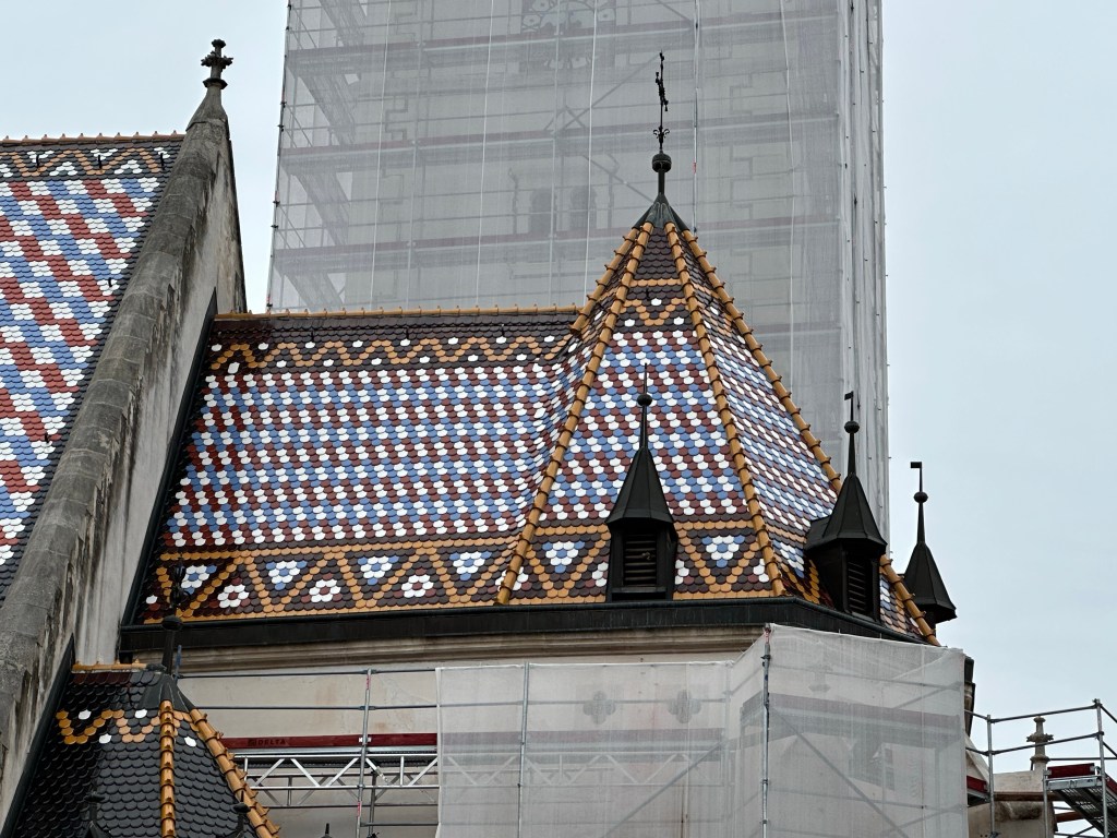 Ahead is a beautiful church, St Marks, from the 1300’s but the tiles the 1800’s. It is mostly covered in construction but the tiles are still visible. We learn that all these “under renovation” buildings are a result of a bad earthquake about 3 years ago. Only one life was lost fortunately because most were on lockdown and not at their place of business due to covid. The repairs needed to all their historic sights are in the many billions so it might be a while before we see Zagreb at its finest again. Hidden behind the screens I can tell there are some pretty impressive sights here.